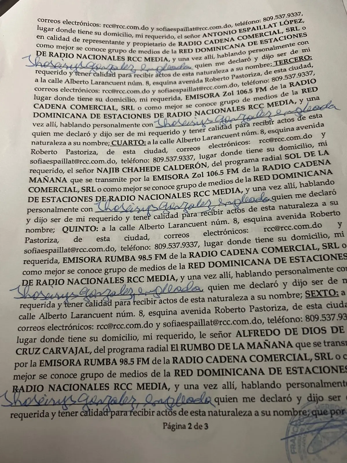 El acto de alguacil 914-2023, emplaza al grupo de medios de la Red Dominicana de Estaciones de Radio Nacionales (RCC Media) y su propietario Antonio Espaillat López; la emisora Zol 106.5 FM; Najib Chahede Calderón, del programa radial Sol de la Mañana, que se transmite por la emisora Zol 106.5 FM, así como la emisora Rumba 98.5 FM y al comunicador Alfredo de la Cruz, del programa radial El Rumbo de la Mañana, a retractarse de la referida denuncia en el plazo de un día franco.