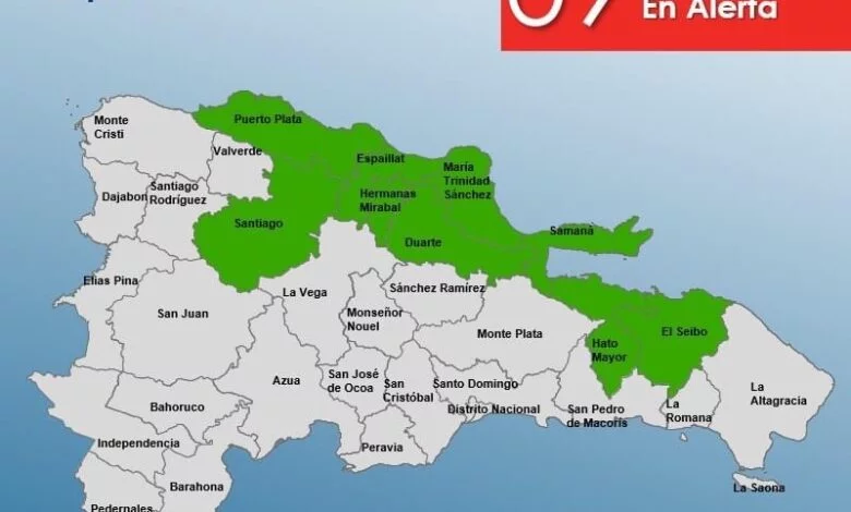 Estas son las provincias en alerta verde: María Trinidad Sánchez Espaillat| Santiago, Samaná, Hermanas Mirabal, Hato Mayor Duarte, Puerto Plata y El Seibo.