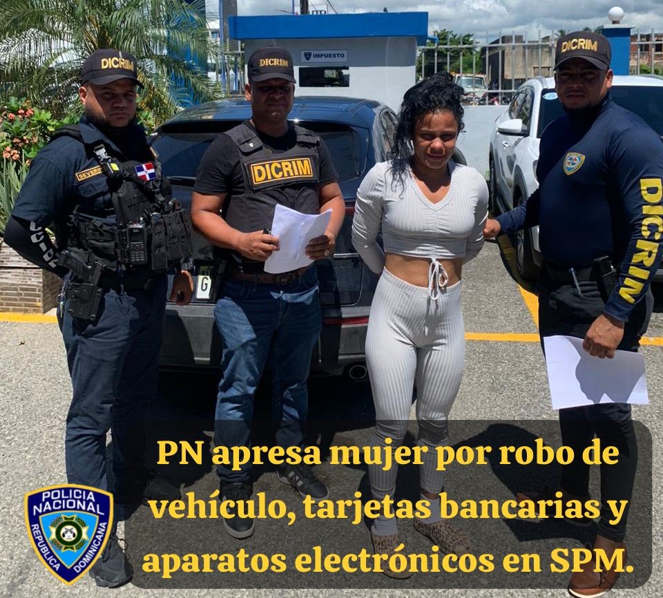 La detenida es la nombrada Katherinne Corripio González, de 31 años, residente en el sector Papa Gallo de La Romana, por el hecho de esta haber sido sorprendida en flagrante delito abordo del vehículo marca Manza, modelo CX30 GSFWD, color negro, el cual había sido sustraído horas antes del Edifio Torres Vista Moll, de la referida provincia, al mismo se le estaba dando seguimiento vía GPS.