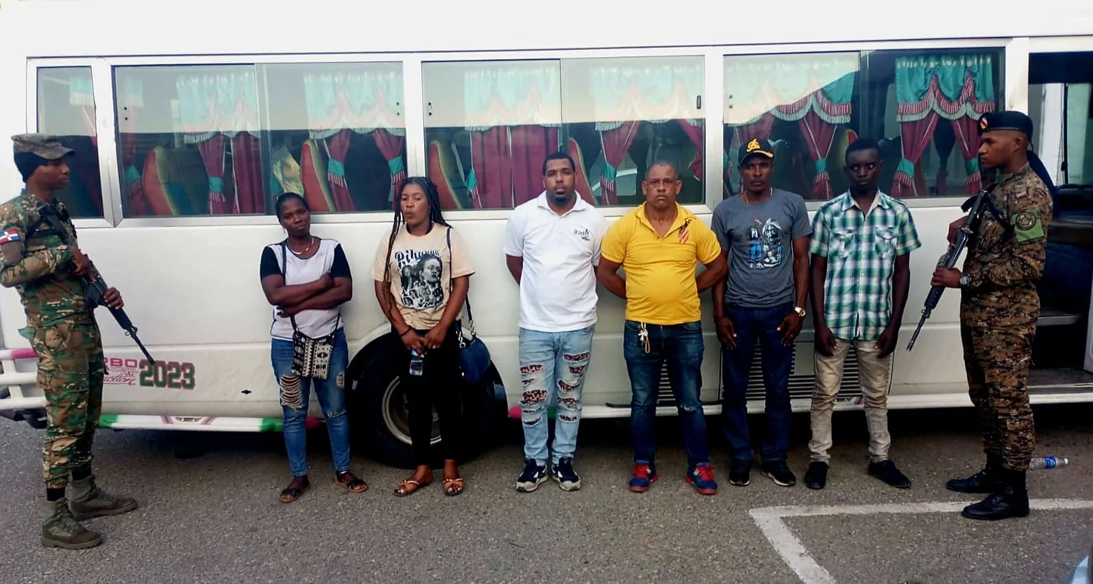 En otro autobús Mitsubishi, placa I-079429, color blanco, fueron puestos bajo custodia militar, Junior Taveras Batista , conductor y Félix M. Aquino Paniagua , cobrador, por el hecho de transportar a otros 04 nacionales haitianos en condición migratoria irregular.