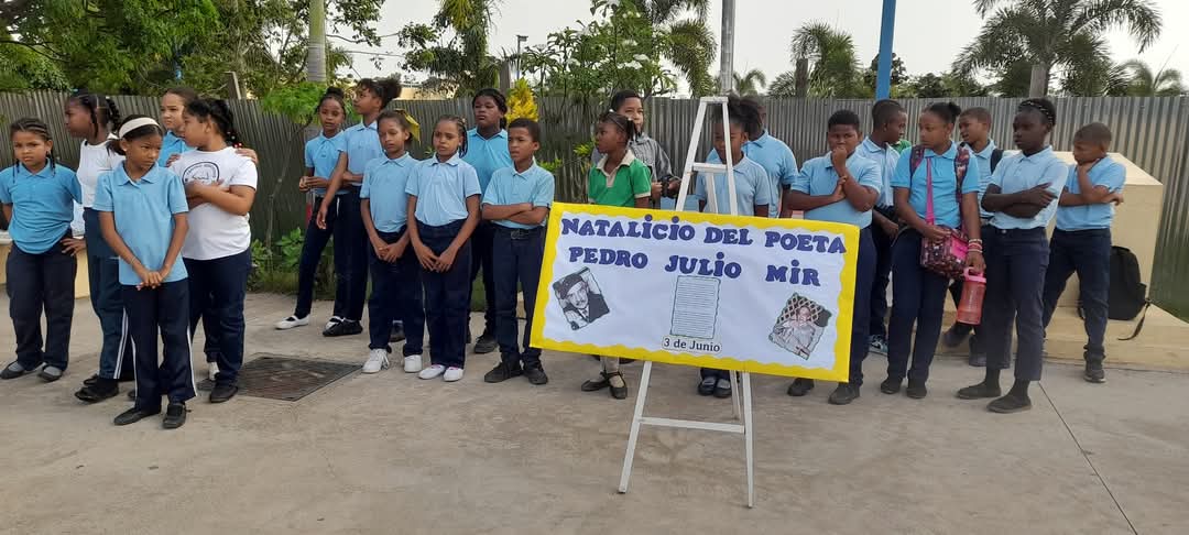 Estudiantes de la Escuela Primaria Profesor Sergio Augusto Beras del Distrito Escolar 05-01 en esta ciudad, rindieron ayer honor al poeta Don Pedro Julio Valentín Mir