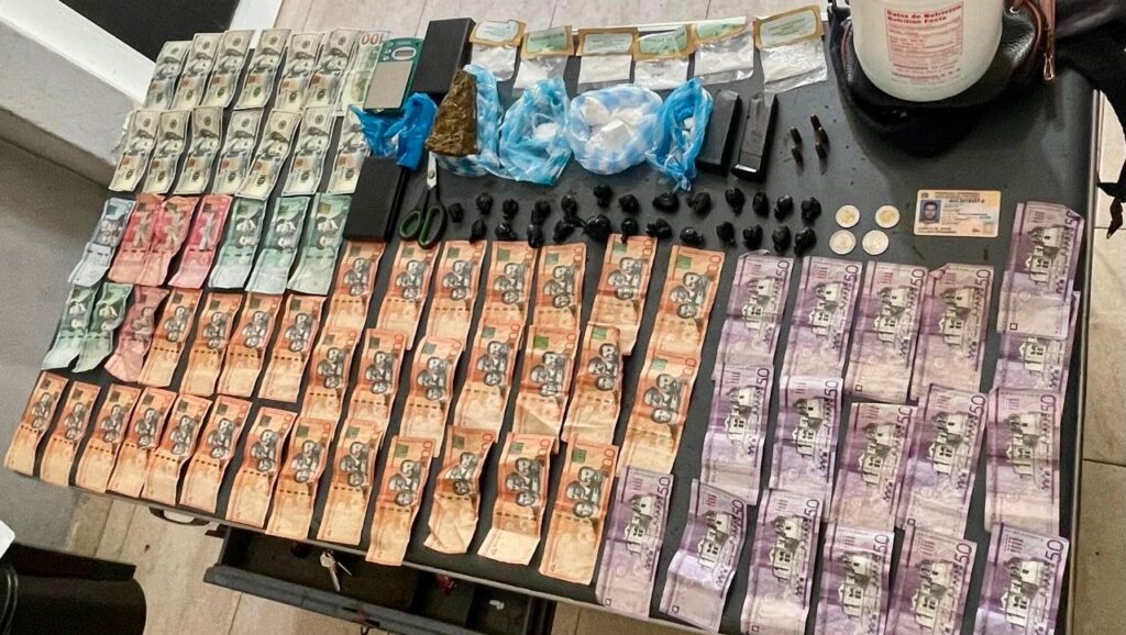 Durante la requisa se ocupó una mochila que contenía 25 porciones de un vegetal presumiblemente marihuana, tres porciones de presunta cocaína y una de presunto crack, así como la suma de 11,720 pesos en efectivo en distintas denominaciones, 14 billetes de 100 dólares presumiblemente falsos, dos cargadores para pistola calibre 9mm con cinco cápsulas, tres balanzas, seis sobres de azúcar de leche envueltos en fundas plásticas transparentes y una tijera.