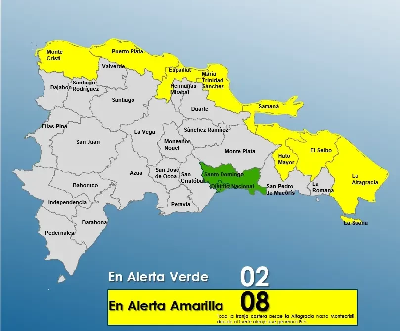 La Dirección del Centro de Operaciones de Emergencias (COE) informó este sábado que, según el boletín meteorológico del Instituto Dominicano de Meteorología (INDOMET), el huracán Erin, de categoría 5, provocará condiciones climáticas adversas en gran parte del país.