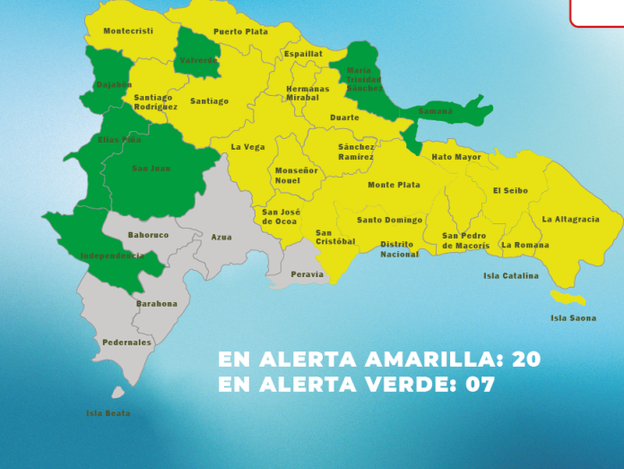 Las provincias en alerta amarilla son Santo Domingo, Distrito Nacional, Santiago, Duarte (en especial el Bajo Yuna), San José de Ocoa, Puerto Plata, El Seibo, Monseñor Nouel, Hato Mayor, Santiago Rodríguez, La Altagracia, La Vega, San Pedro de Macorís, San Cristóbal, Sánchez Ramírez, Montecristi, Monte Plata, Espaillat, Hermanas Mirabal y La Romana.
